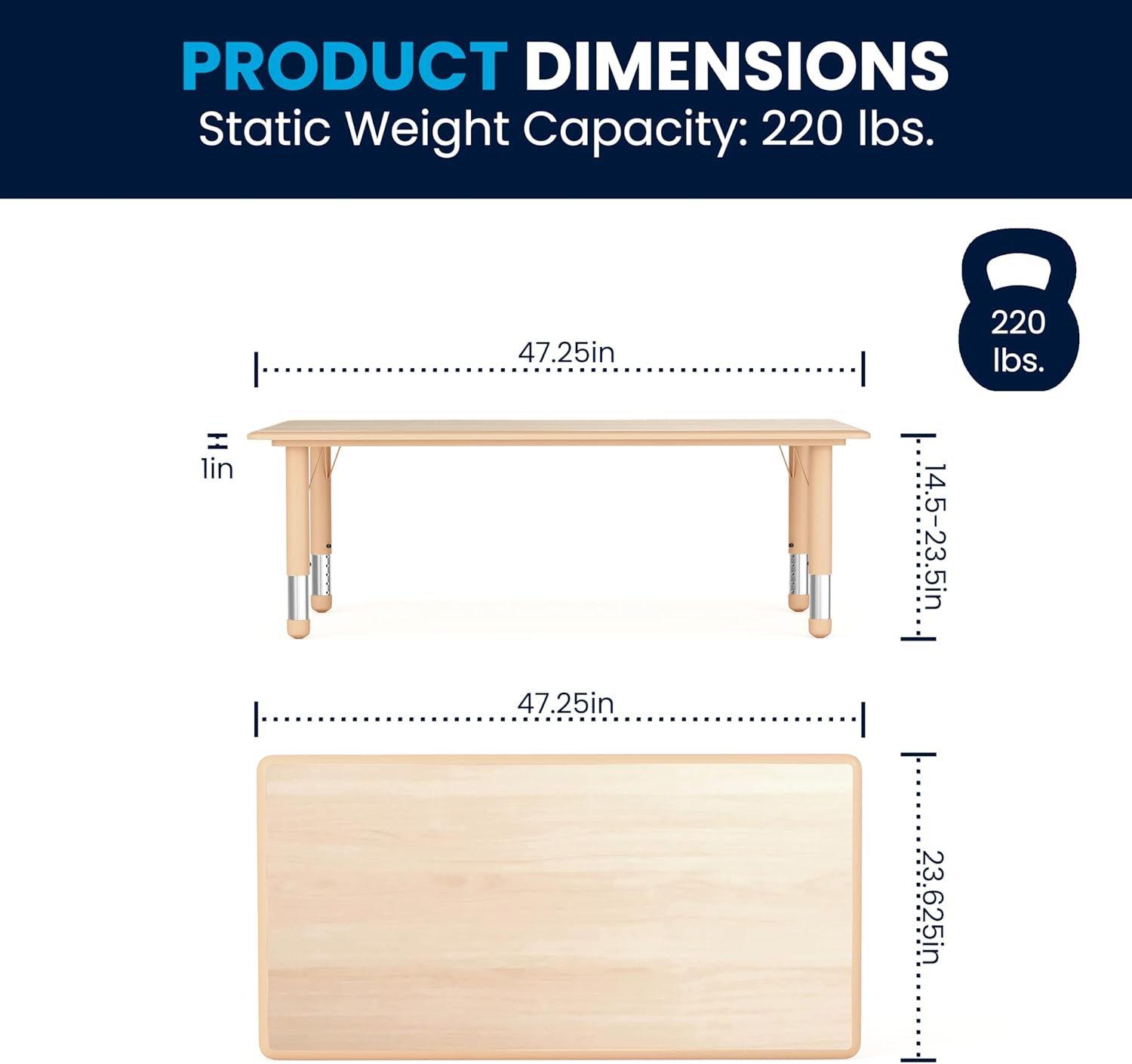 - HOME OR SCHOOL USE: Measures 23.625" W x 47.25" D x 14.5-23.5" H and is applicable in the home and school environments, making it perfect for classrooms, playrooms, dining rooms, kids bedrooms, and daycares