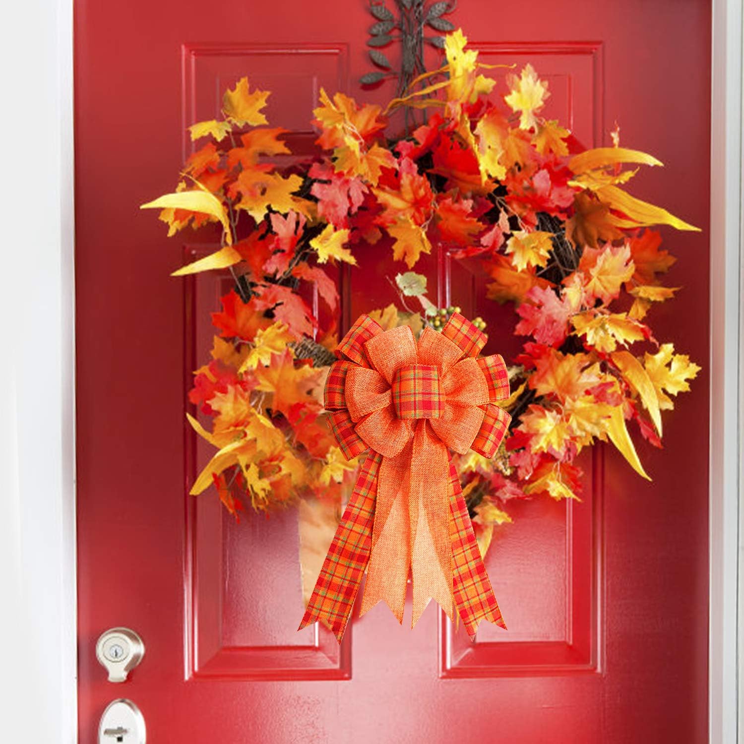 Iceyyyy Extra Large Fall Wreath Gift Bow -18.8x10.6inch Orange Buffalo Plaid Check Wreath Bow Swag Bow Thanksgiving Wreath Pre-Tied Bow For Fall, Thanksgiving, Christmas, Home Indoor Outdoor Ornaments