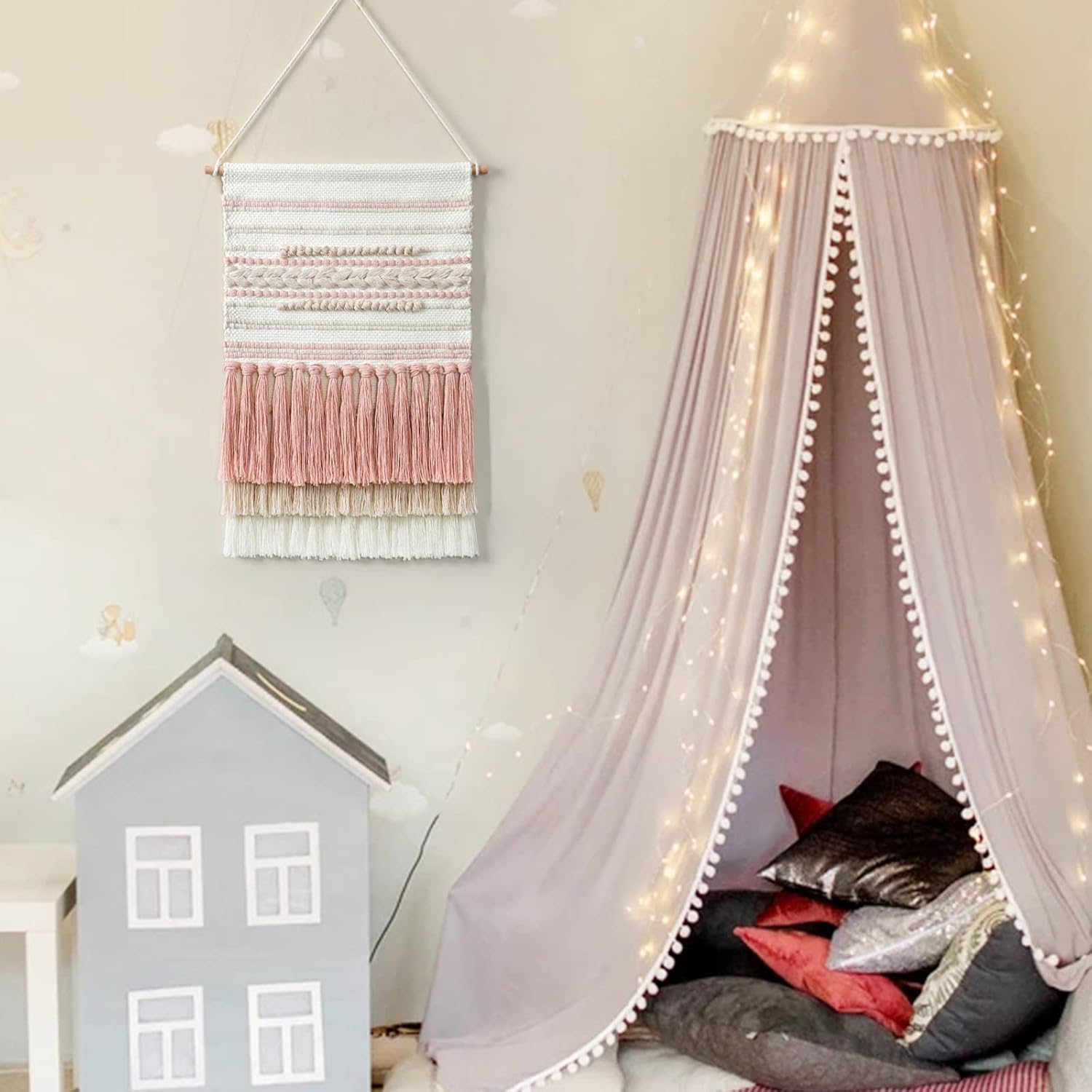 Dremisland Macrame Woven Wall Hanging Home Decor Bohemian Beige Geometric Wave Art Decor with Wool Ball and Tassle-Elegant Apartment Bedroom Dorm Room Door Decoration (Pink Line)