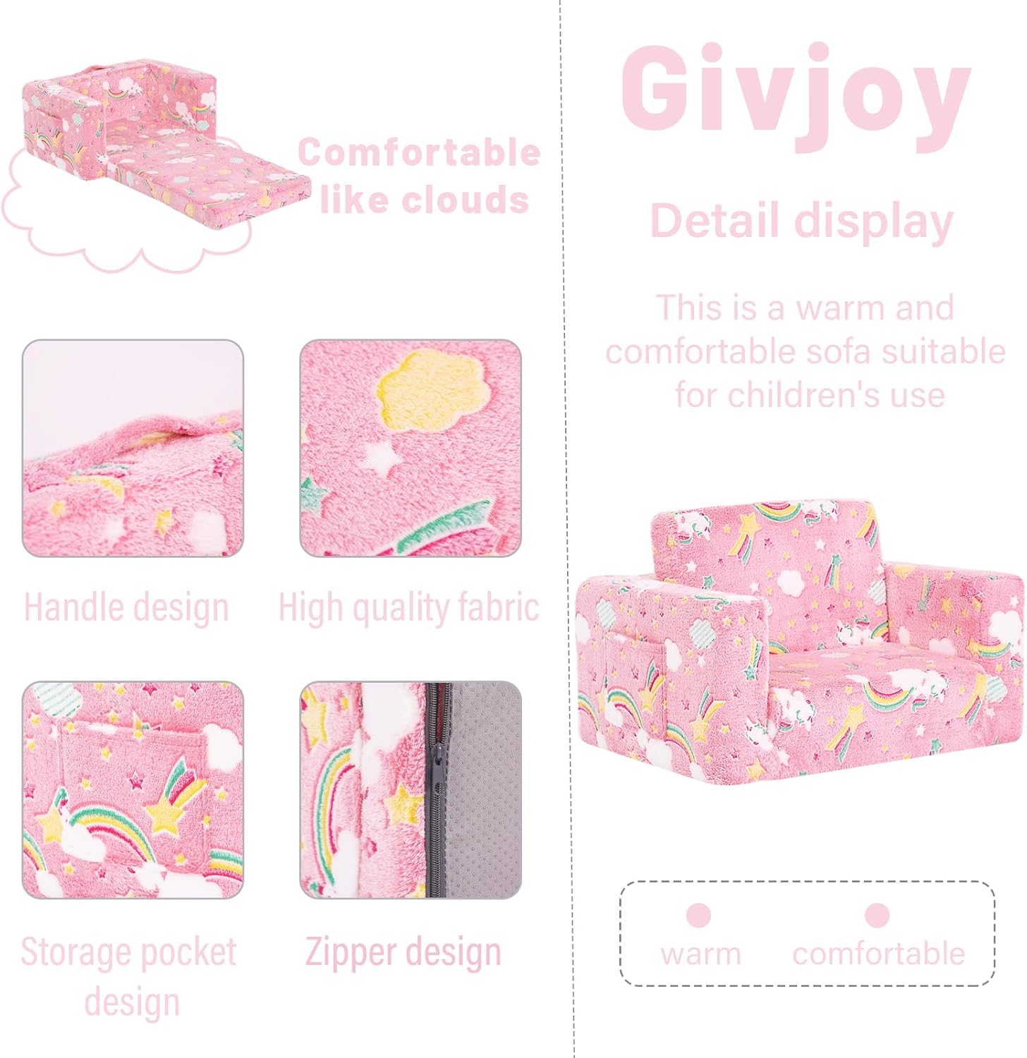 - ăPractical Pocket & Handy Handleă Thoughtfully designed 2-in-1 kid couch sofa also has convenient pockets for kids to store their favorite story books, dolls or plush toys! Additionally, a practical handle is easy for toddlers to transport this kids fold out couch safely from room to room.