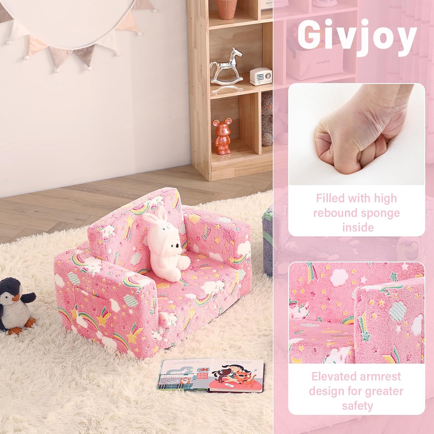 - ăSafe & Skin-friendly MaterialăThe cover of 2-in-1 kids sofa couch is made of high quality short plush which is durable and skin-friendly. High density and hardness of the supportive foam keep the sturdy toddler sofa couch in shape and provide our lovely kids all-day comfort. Its premium quality also ensures immediate expansion without needing a long wait.
