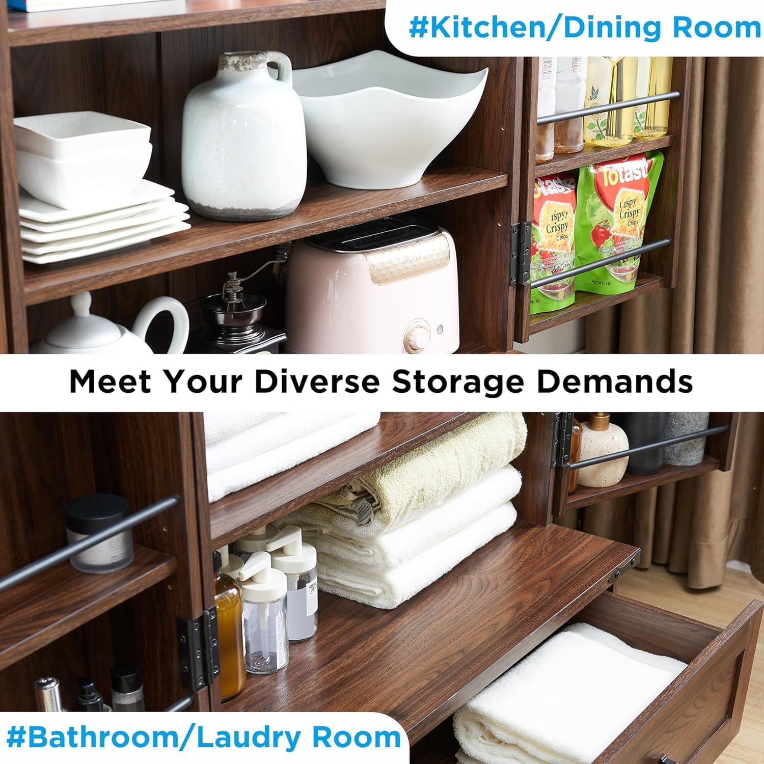 - ENJOY THE WELL-ORGANIZED STORAGE. The 12-door shelves, strategically designed with 3 different heights, maximize top cabinet space, ensuring easy access to small items like spices and olive oil. With a large cabinet, a spacious slide-out drawer, and 12 versatile door shelves, this pantry accommodates everything from food and dinnerware to kitchen appliances, effortlessly tidying up any space.