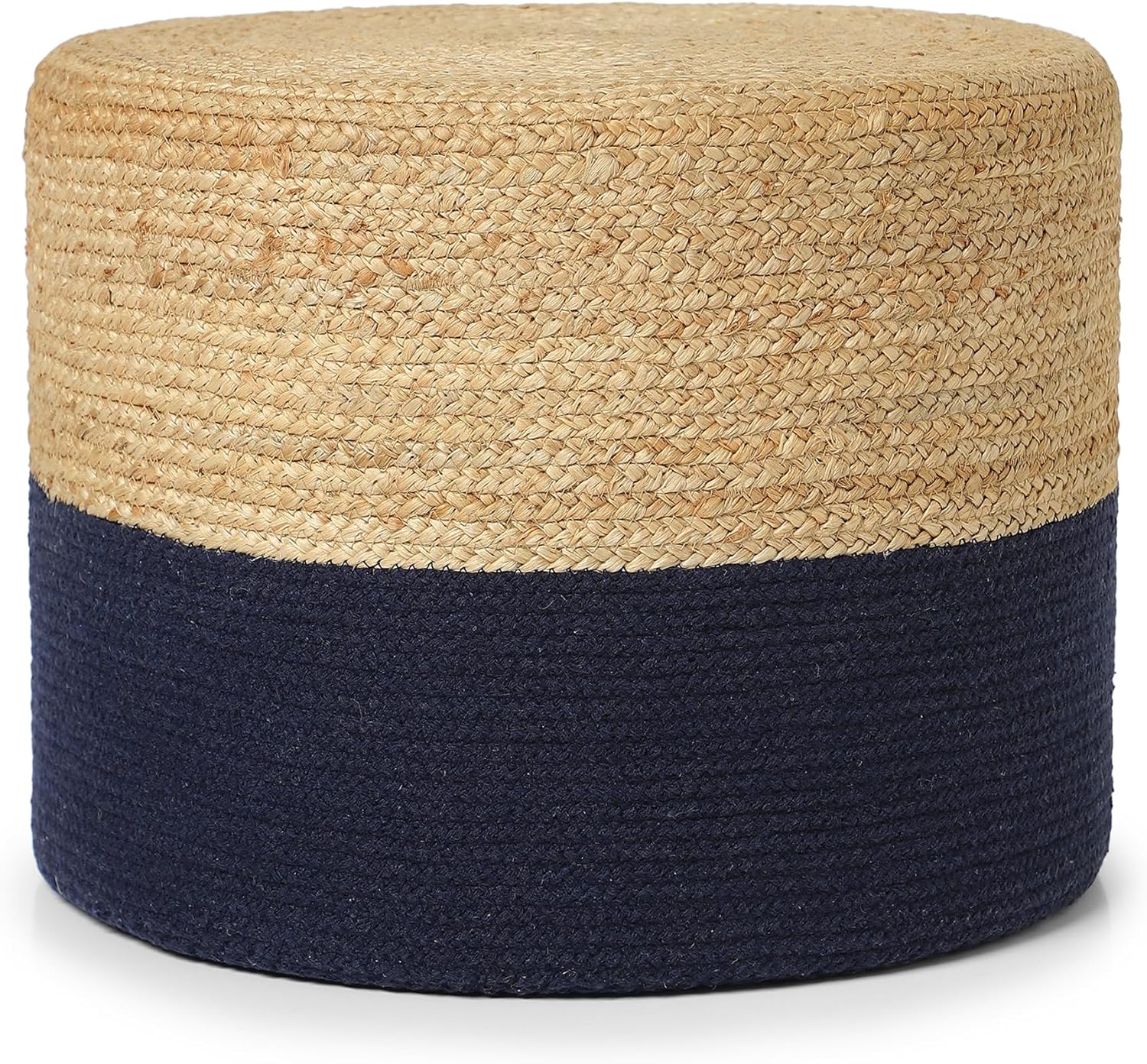 REDEARTH · Cylindrical Pouf Foot Stool Ottoman - Jute Braided Pouffe Poof Accent Sitting Footrest for Living Room, Bedroom, Nursery, Patio, Lounge & Other Rooms (Navy Natural, 18"x18"x14")