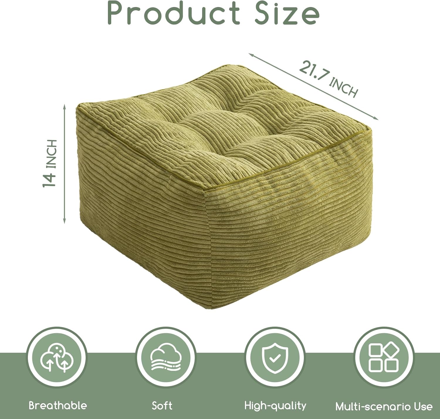 HIGOGOGO Square Stuffed Pouf Ottoman, Corduroy Poufs with Foam Chunk Filling, Furry and Fluffy Pouf Foot Stool Storage Ottoman, 21 X 21 Floor Poufs Foot Rest for Living Room, Green