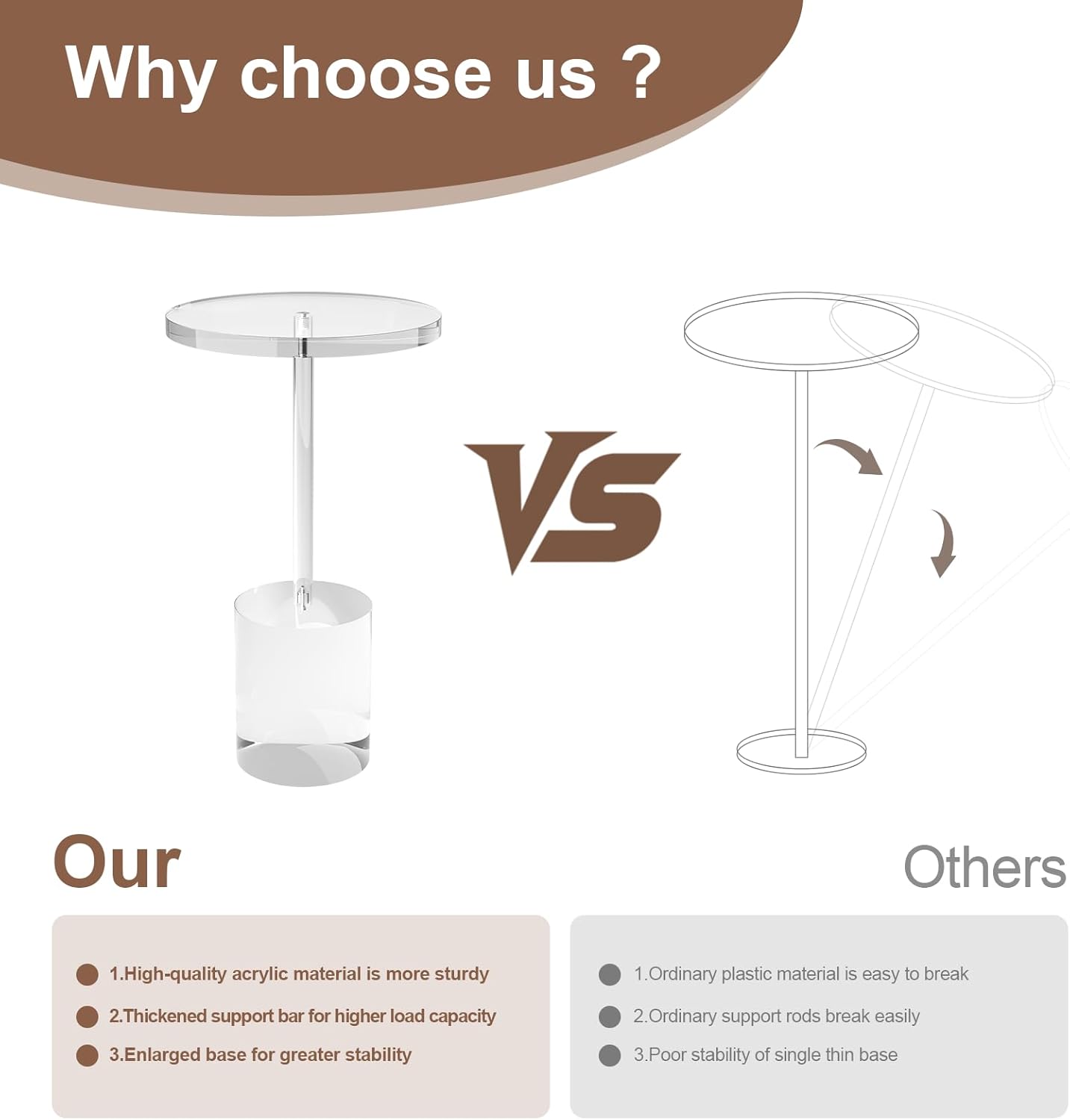 - ăModern & Minimalist DesignăThis acrylic end table features a circular countertop connected to a cylindrical base via slender columns. Its sleek, minimalist aesthetic complements various home decor styles. Blending decorative appeal with functionality, itâs ideal for living spaces.