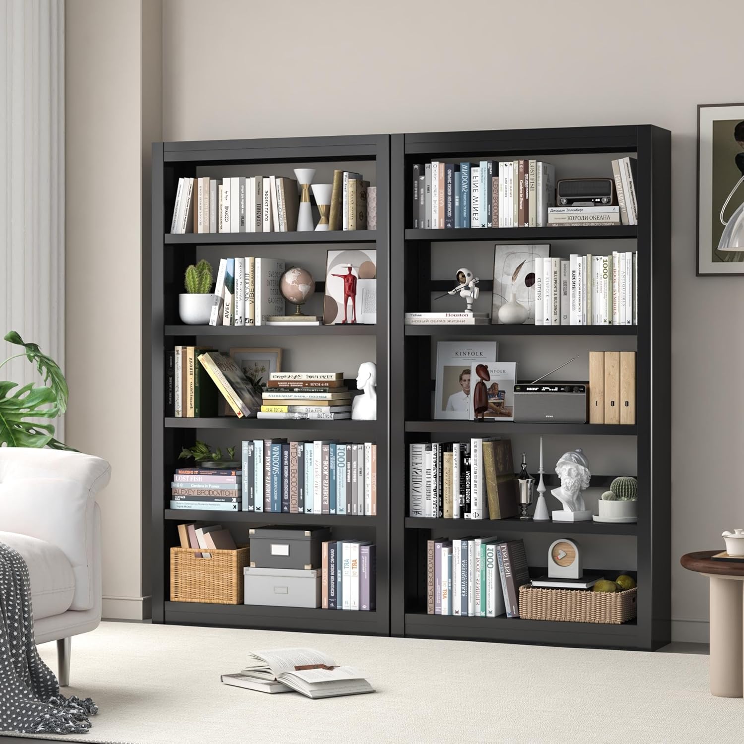 - â ăAdjustable 5 Tier Bookshelfă This black bookshelf design with easy-to-adjust storage shelves. Customize book shelves heights to fit tall books, decor, or storage bins. Perfect for maximizing vertical space in small rooms, offices, or living rooms. Holds up to 200lbs per shelf â 3x stronger than wooden bookshelves