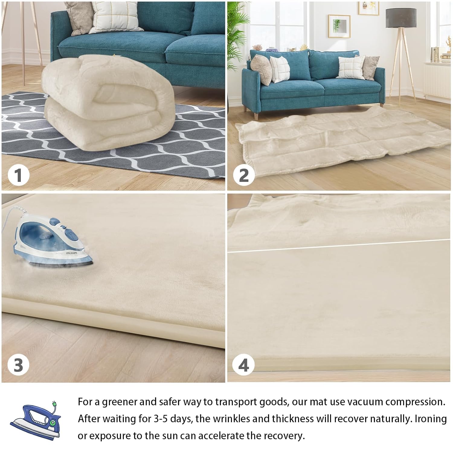 - 🌟HOW TO CARE FOR YOUR MAT:When you open the package,it may be wrinkled,very flat and inelastic.Don't fret - this is normal! As long as it is left for 3-5 days, the mat will naturally regain its thickness and elasticity. we recommend steaming or ironing it to speed up recovery. After you have completed the steaming/ironing, your thick floor padded mat should rebound and be ready to use!