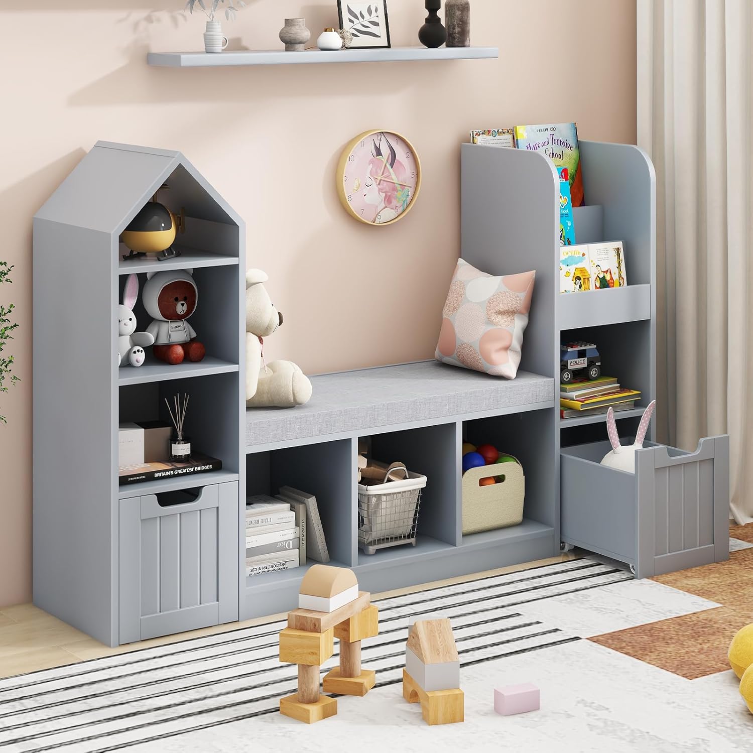 Vabches Toy Storage Organizer for Kids Bookshelf with Reading Nook, Multifunctional Bookcase with 7 Storage Cubbies, 2 Movable Drawers and Seat Cushion for Keeping Kids' Toys Books Organized, Grey