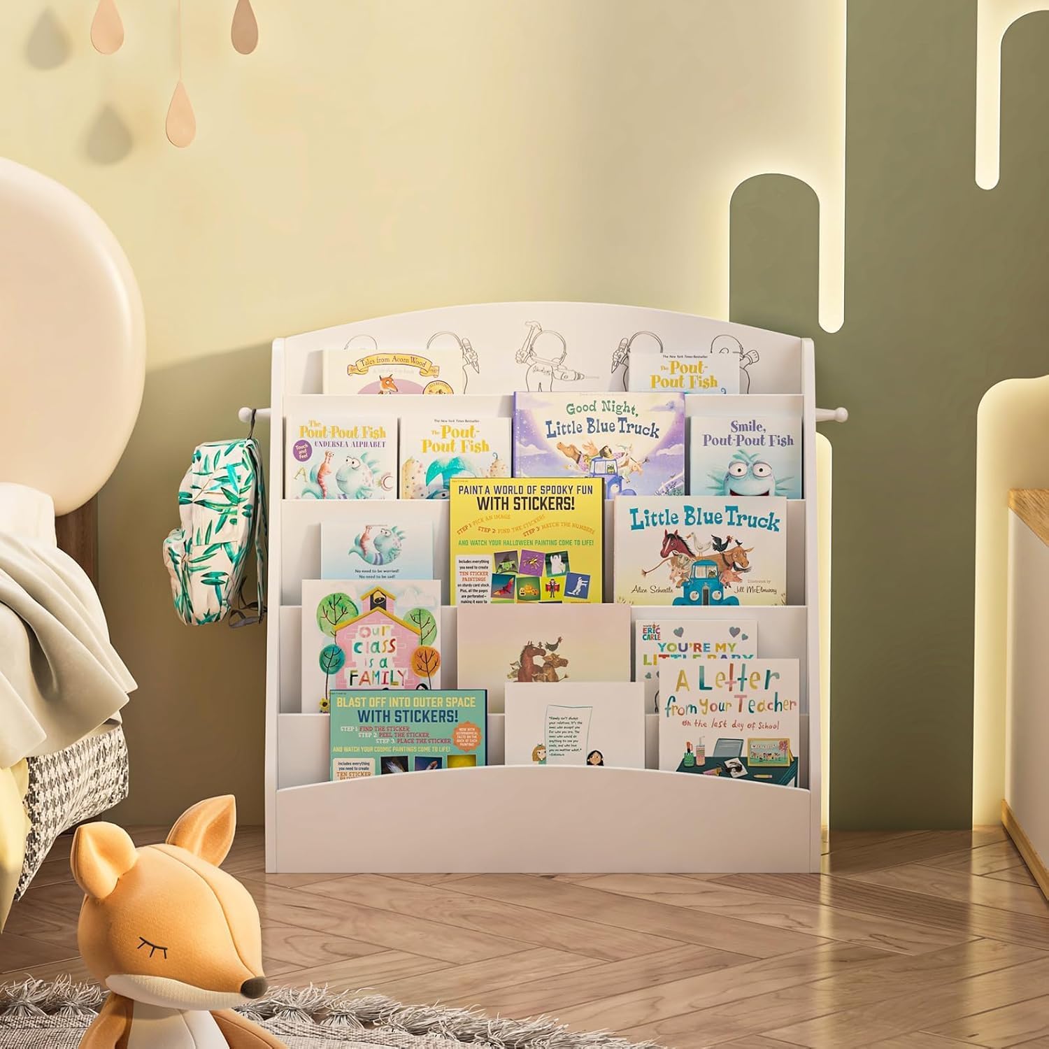 5-Tier Kids Bookshelf Montessori Toddler Book Rack Baby Bookcase Floor Front Facing Magazine Display Shelf for Bedroom Playroom Nursery Classroom Kindergarten Wood (White)